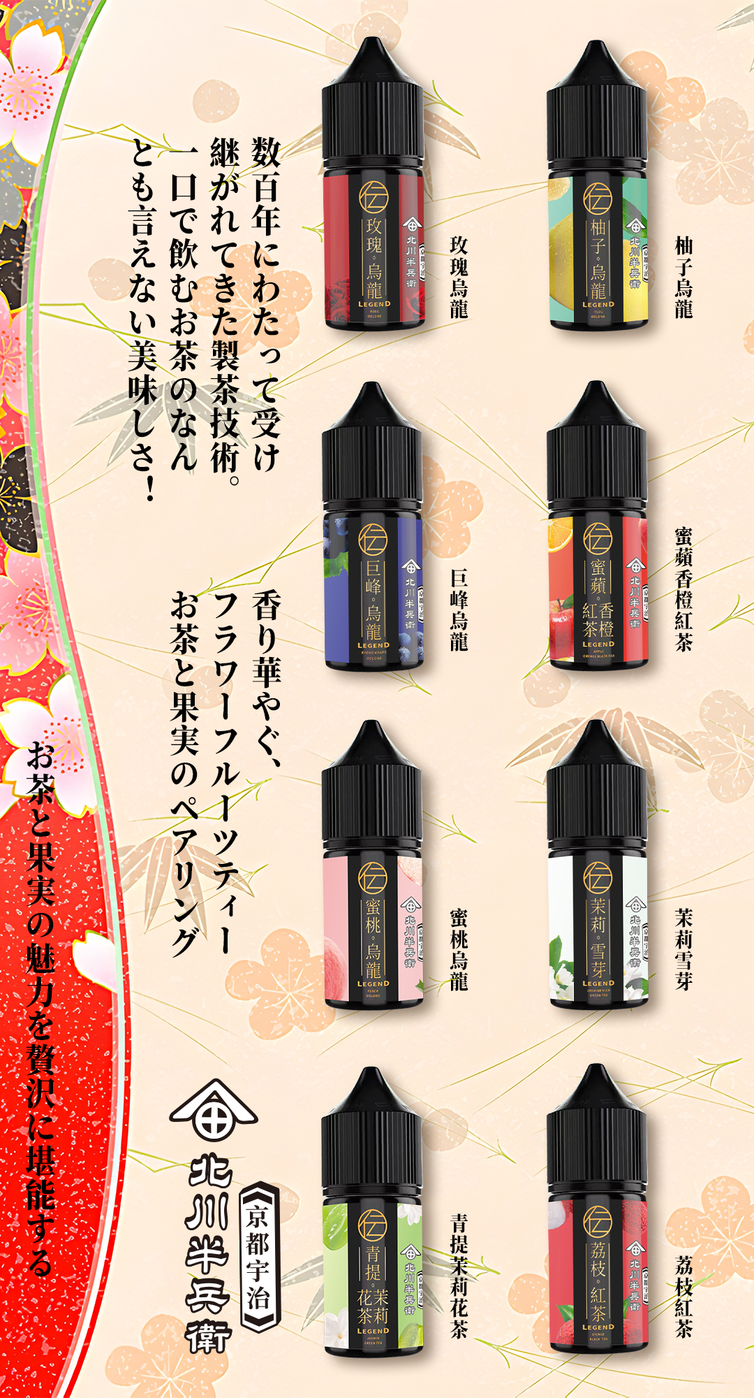 巨峰烏龍, 柚子烏龍, 玫瑰烏龍, 茉莉雪芽, 荔枝紅茶, 蜜桃烏龍, 蜜蘋香橙紅茶, 青提茉莉花茶